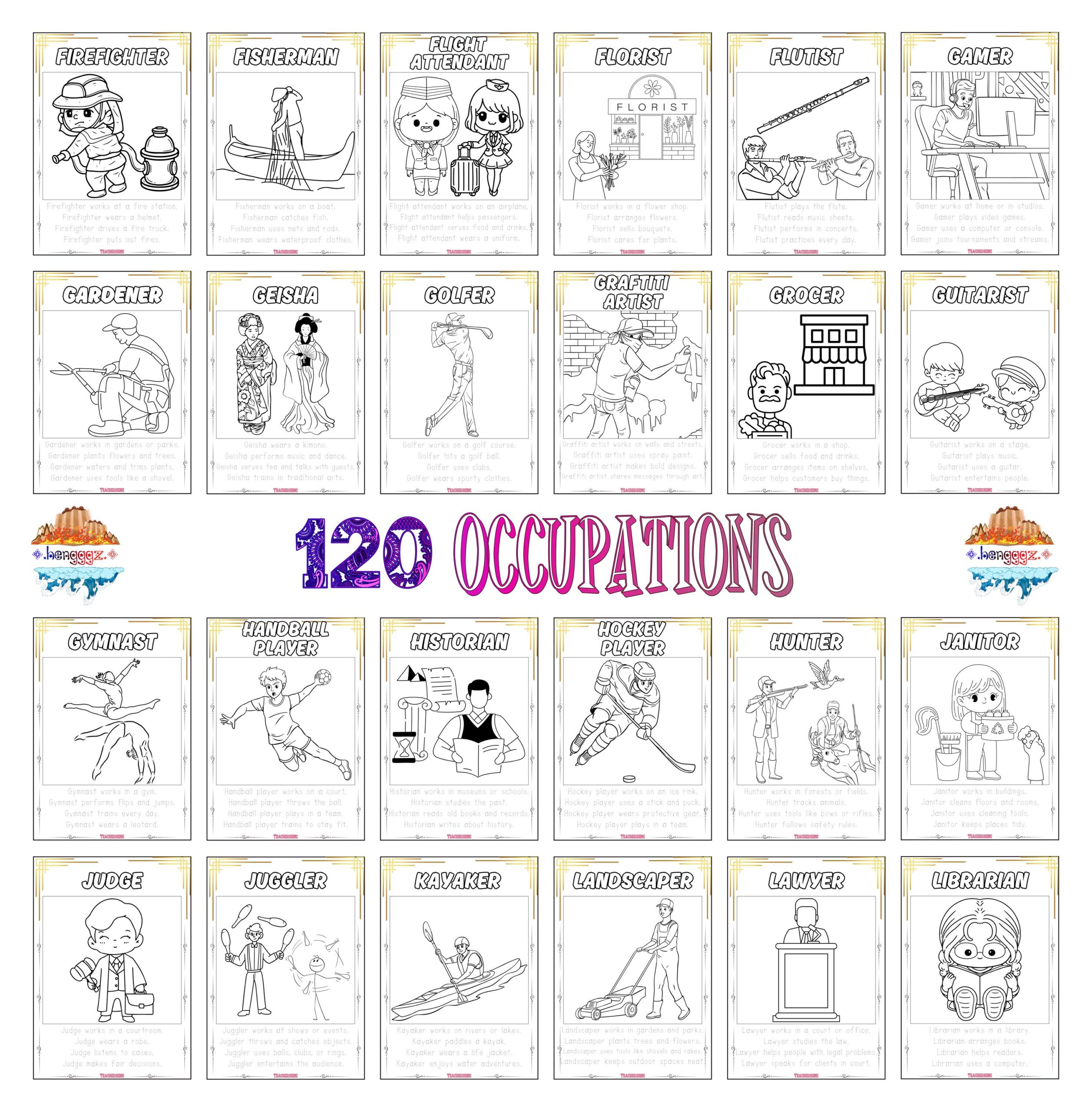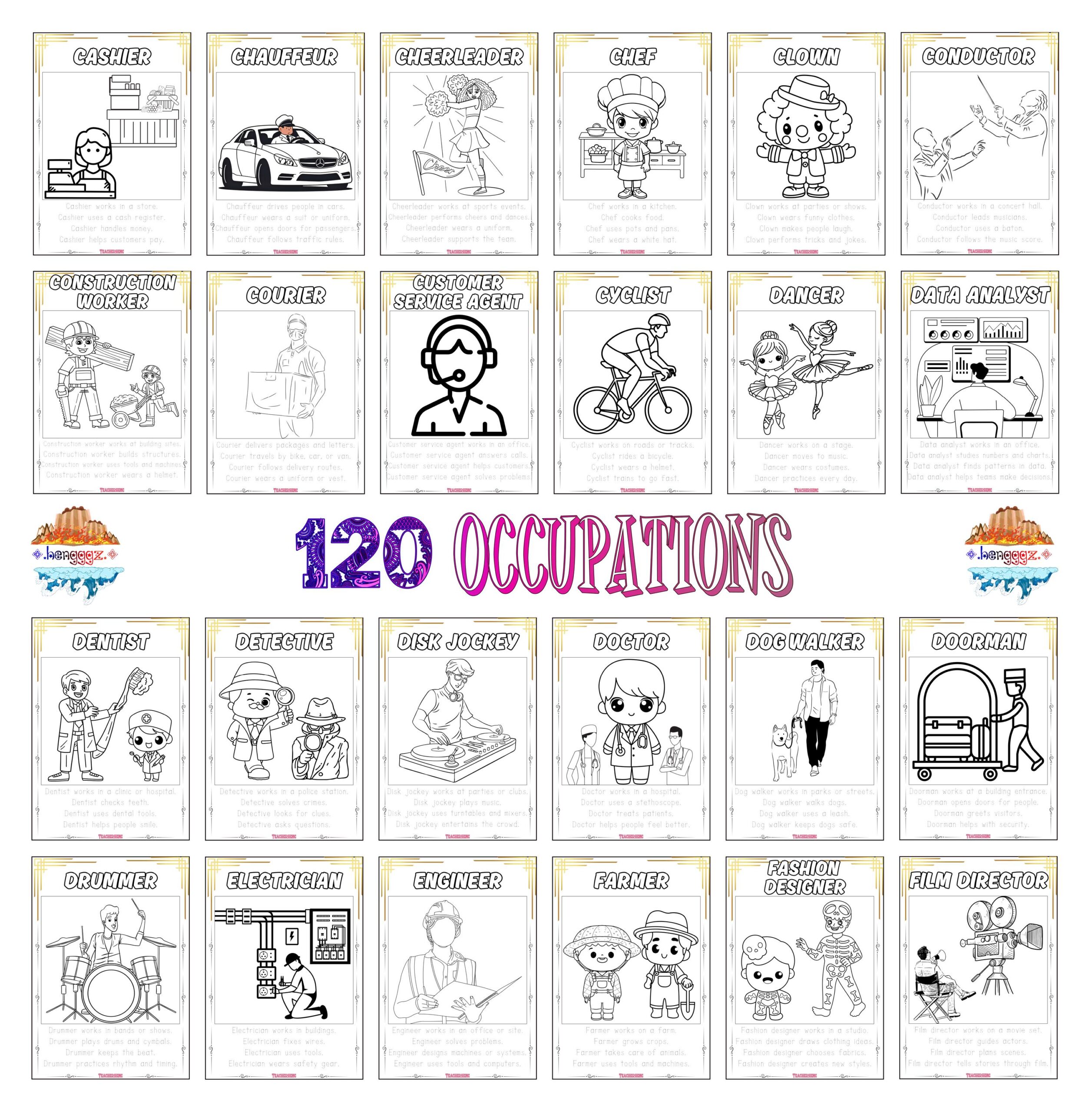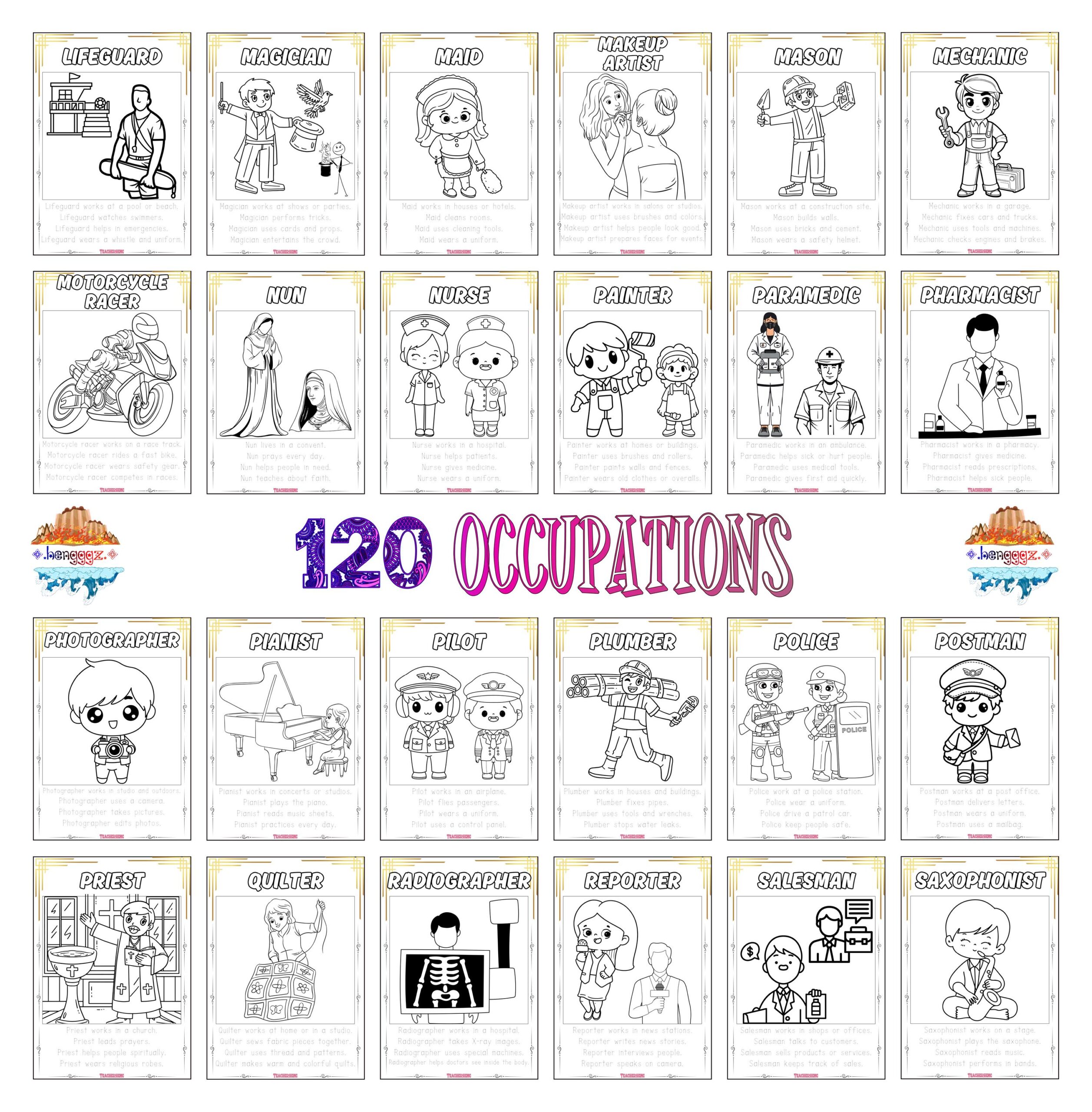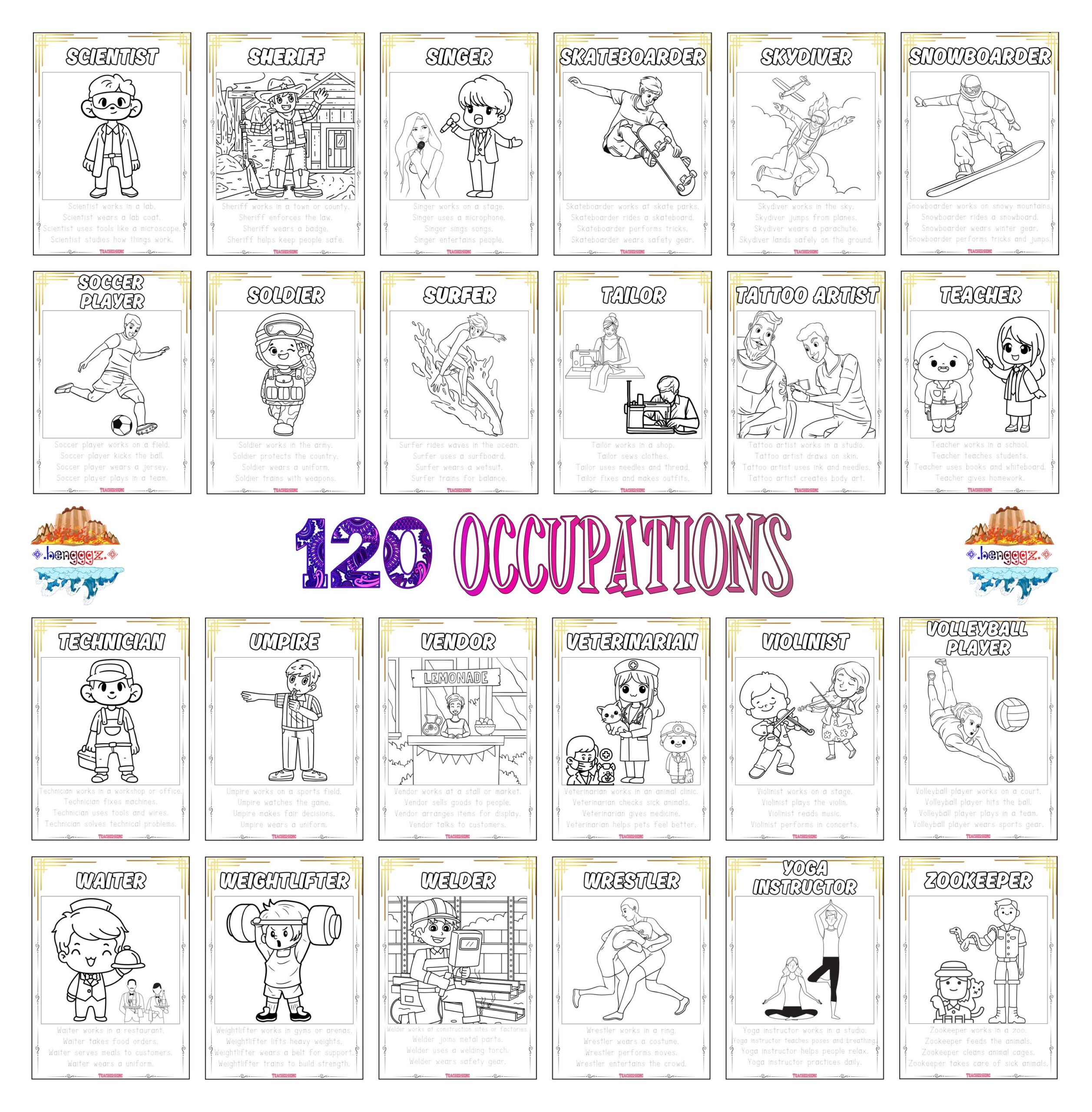 120 Occupations Coloring Book | Learn Jobs and English | ABC Tracing | ESL and Writing Practice | Grayscale Printable PDF